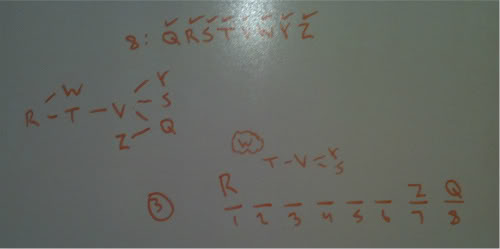 On our initial global diagram, we could have taken note that only 2 possible variables could be placed first, either R or Z. The last variable could be any one of W, Y, S, or Q. Sometimes it can be beneficial to think about those things before heading into the questions.