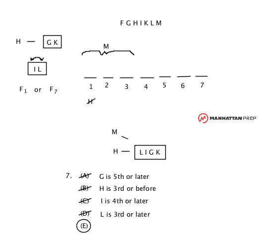 (A) Putting G 4th means that you have H L I G K as your first five people. That breaks two rules: H can't be 1st, and we didn't save a spot for M to be 1, 2, or 3.